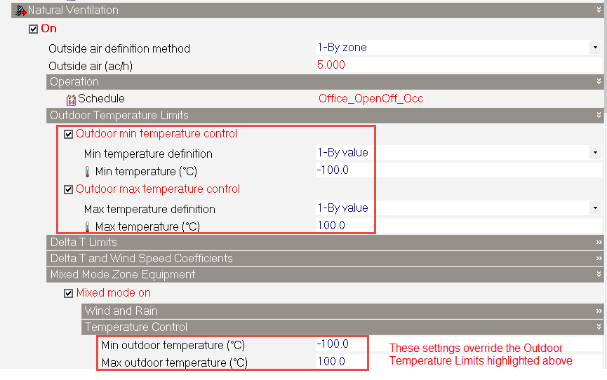 Note: When using Scheduled natural ventilation, the Minimum/Maximum outdoor temperature Mixed mode shut off values described above will override the settings made under the Outdoor Temperature Limits header.