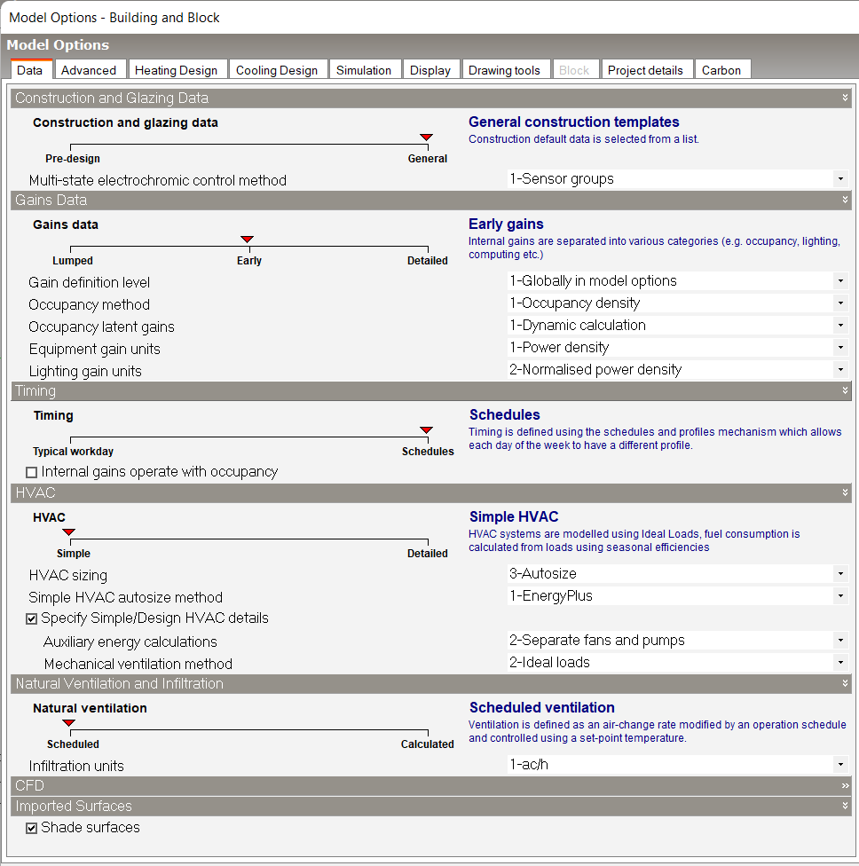 The descriptions to the right of the sliders, together with the various drop list selections, provide a summary of the current model options.