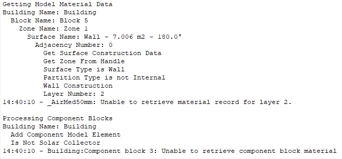 If errors are reported, the usual reason is that materials referenced by constructions or component blocks are missing from the model. See example errors below.