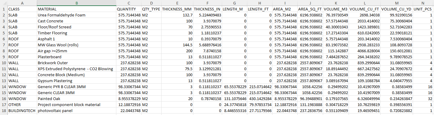 Opaque materials - material quantities are calculated by summing the area and thickness of construction material layers for each surface in the model. The embodied carbon data for each material is defined later within One Click LCA by mapping project materials to data points in their database.