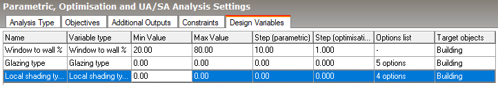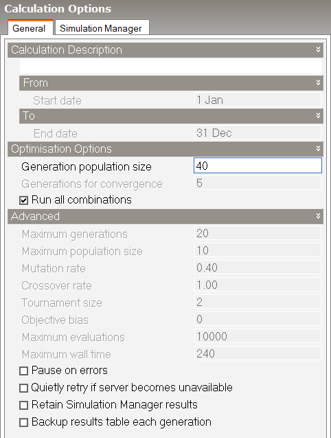 Navigate to the Optimisation + UA/SA tab on the Simulation screen and press the Update toolbar icon to open the Optimisation Calculation Options dialog and make the following settings. These should be the same or similar to the defaults.
