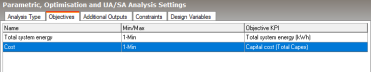 2. Go to the Objectives tab and add 2 new objectives for construction capital cost and total system energy. You can either edit the existing objectives or first delete those and create 2 new objectives. The steps involved are described below.