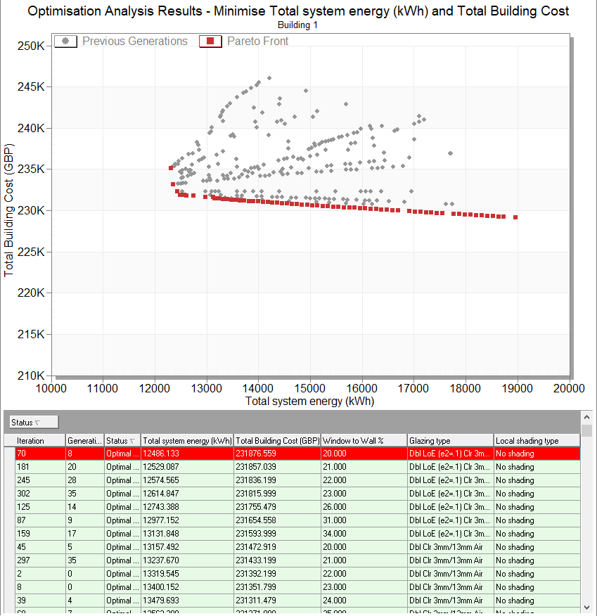 The optimisation results showing the trade off between Total energy consumption and capital cost will be dependent on the costs associated with the various building components, especially the glazing, external walls and overhang shading fins. Given the default costs used in this model, we can see that for a balanced energy performance at 12486 kWh, it necessary to spend 231,876 GBP for 20% WWR, double glazed low-e glazing with no overhangs.