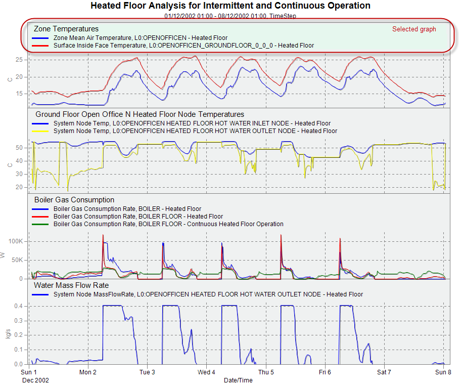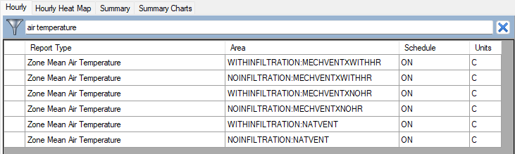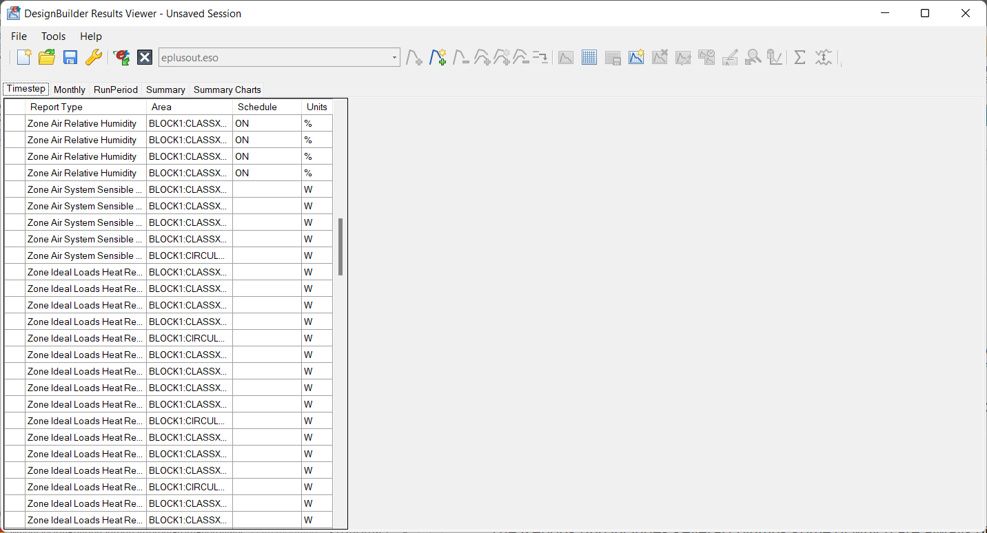 When a dataset is loaded from a DesignBuilder simulation the associated eso and htm results files are loaded together. Depending on the data that was generated in the simulation, various tabs may be available: