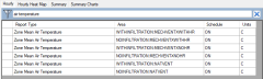 Sorting the reports can also help quickly find particular data. To sort the data by a particular column click on the column header that you wish to sort by. For example to see data sorted by Area click on the Area header. This will collect together all data for each zone, HVAC component, Environment etc. in the list. In the screenshot below the data is sorted by Area and user has scrolled to view all of the data for the BLOCK1:CLASS8X14 zone: