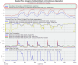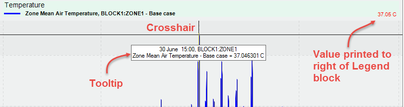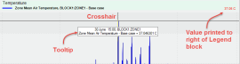 When you move the mouse over a point on a plot, a floating tooltip window appears with data for that point only. Left clicking with the mouse causes the value at that point to be plotted on the right hand side of the graph legend block and a black crosshair is displayed with a vertical and horizontal line centred on the point of interest. The crosshairs can be useful for checking simultaneous values for a range of reports. The value for all other reports currently plotted are also displayed for the current time indicated by the crosshair.
