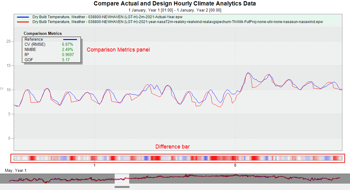 When exactly 2 datasets are displayed on a graph and there is only 1 graph, you can click on the Compare datasets toolbar icon to display the Comparison Metrics panel and the Difference bar. This provides some summary statistical data indicating how well the sample or modelled data fits with the reference or measured data. The screenshot below gives an example where 2 hourly weather datasets for the same location and year are compared. The blue line is for the most accurate "Actual" data based on hourly recordings and is used as the reference dataset and the red line is the sample "Design" dataset.