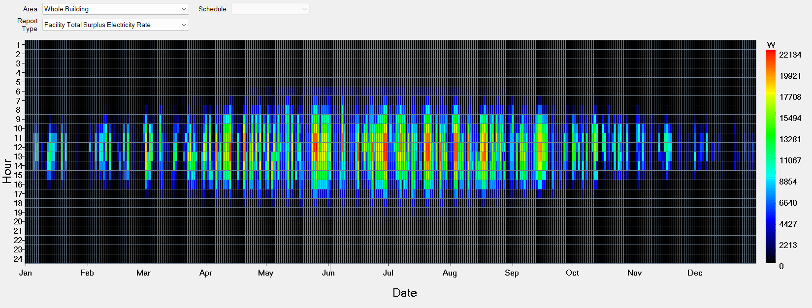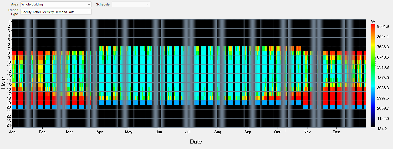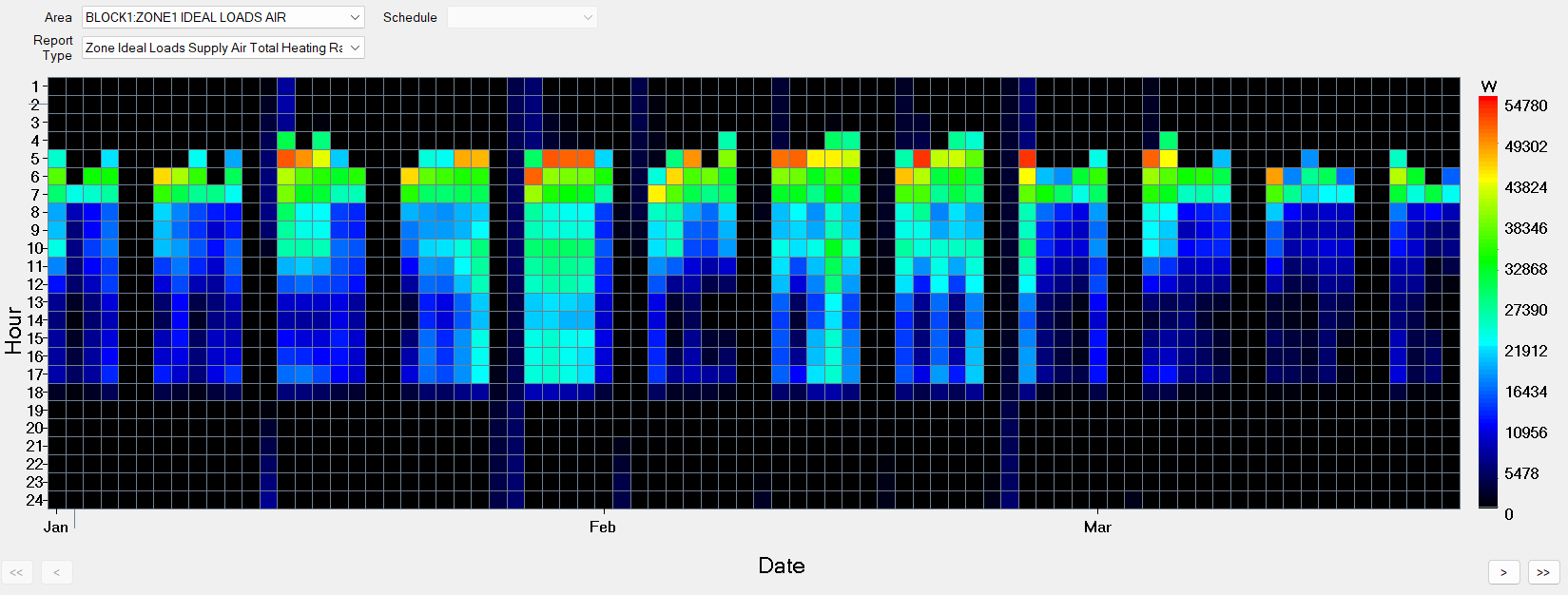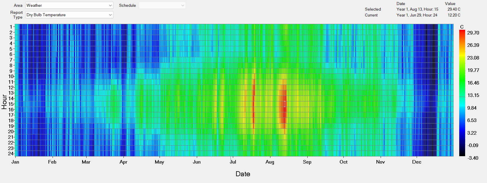 Tip: Any hourly data can be displayed in heat map form including standard outputs, weather data and custom hourly data generated in additional IDF outputs or EMS scripts. See How to Generate and View Extra EnergyPlus Outputs.