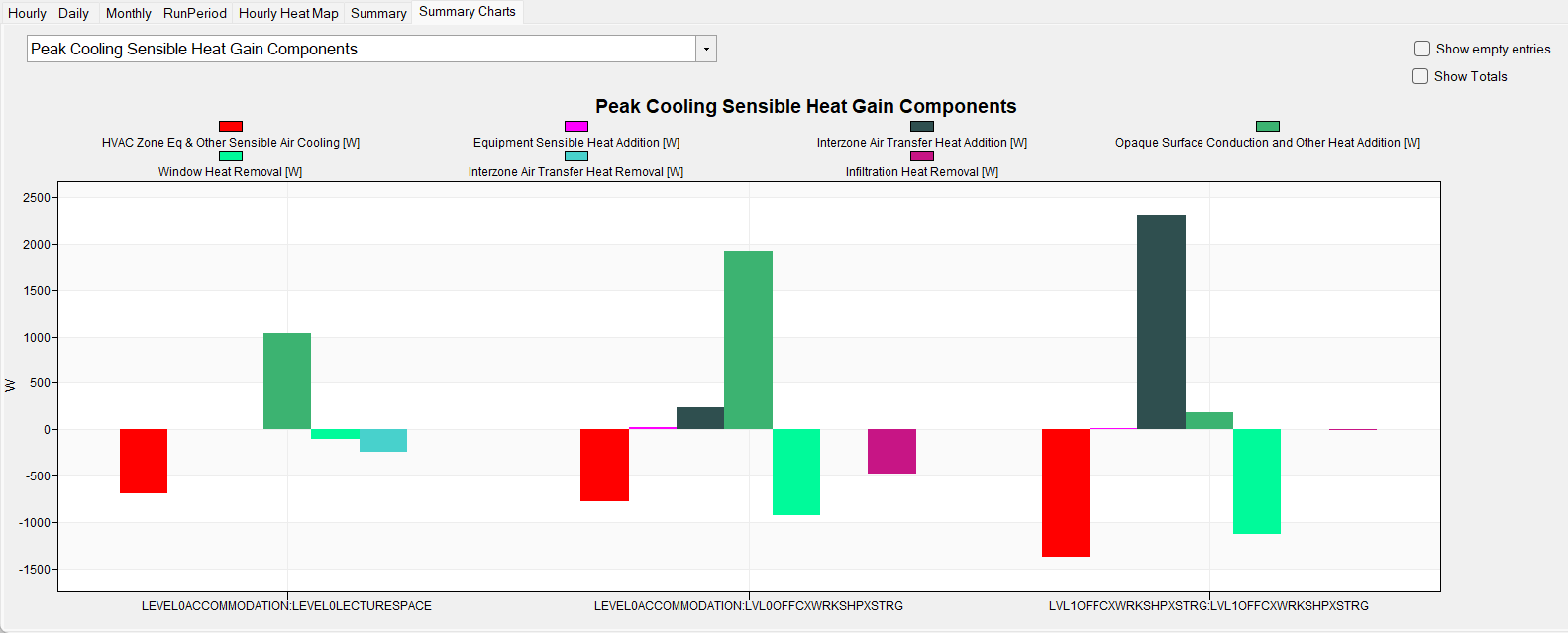 This tab allows most of the annual summary results in the tables on the Summary tab to be plotted graphically in histogram form. For example the screenshot below shows "Peak Cooling Sensible Heat Gain Components" outputs for all cooled zones.