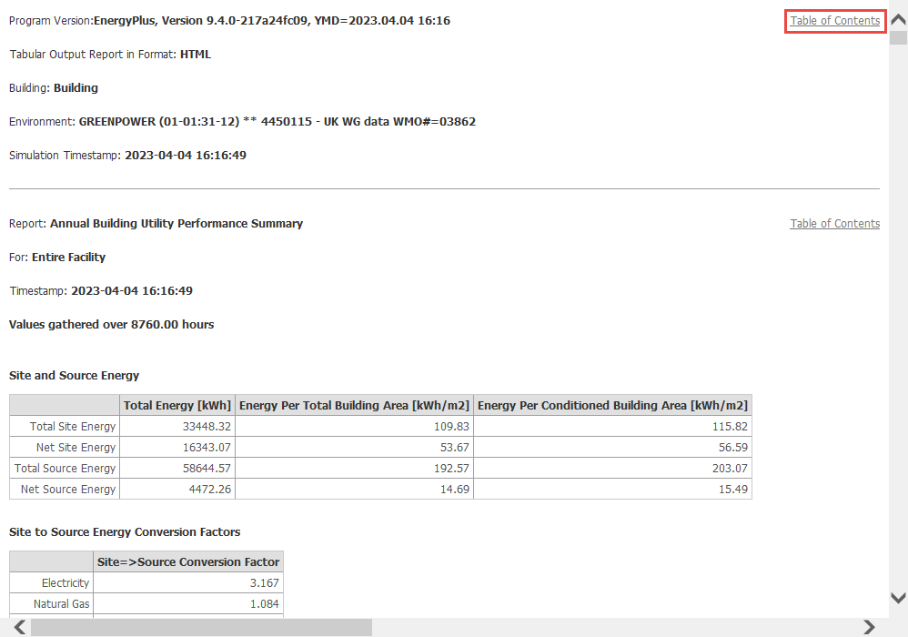 On the Summary tab you will find the summary results report generated by EnergyPlus in html format. This report consists of a series of tables containing simulation output results. It is the same report that is displayed on the Summary tab of the DesignBuilder Simulation screen after results have been loaded. Results tables can be requested in the DesignBuilder Simulation Output options.