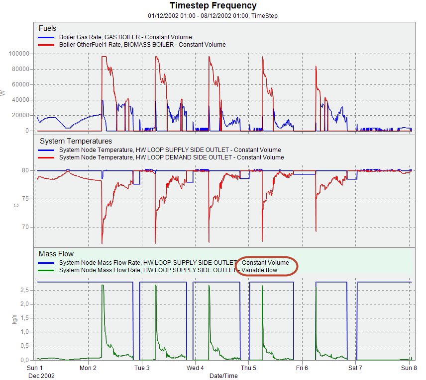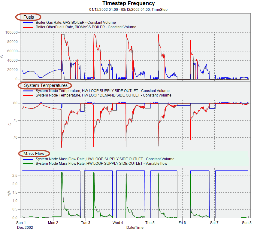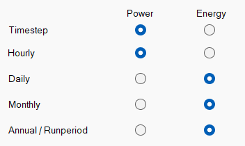 For example if the eso file generated by the simulation includes hourly energy reports which use energy (J) as the units, it will usually by much more convenient to view such results as power (e.g. W or Btu/h). In which case you should check the Hourly / Power radio button in the grid (it is checked by default).