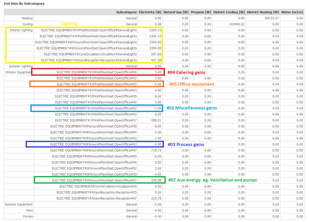 DesignBuilder uses its own electric equipment end use codes to link gains reported in EnergyPlus outputs to the zones in which the equipment is installed. The screenshot below illustrates how the codes link to the various types of equipment defined.