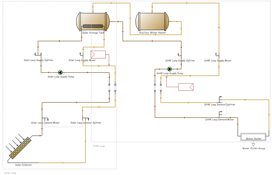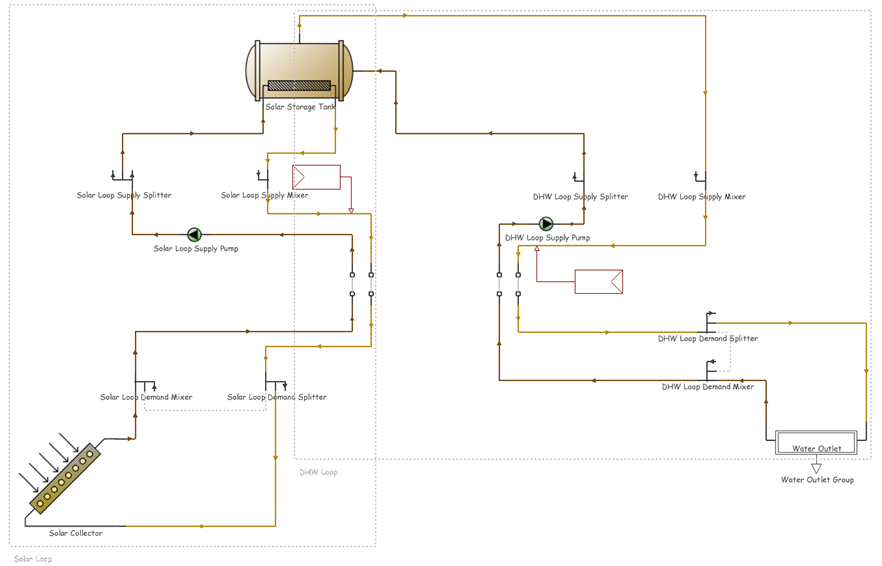 This arrangement of components and loops models a typical solar heating system with 2 tanks: a solar tank with water at potentially high temperatures and an auxiliary tank containing water at temperatures that can be used by heating and/or DHW purposes. The Solar Assisted DHW HVAC template provides this functionality.