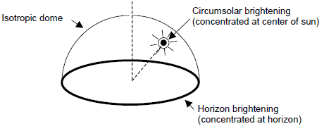 Schematic view of sky showing solar radiance distribution as a superposition of three components: dome with isotropic radiance, circumsolar brightening represented as a point source at the sun, and horizon brightening represented as a line source at the horizon.