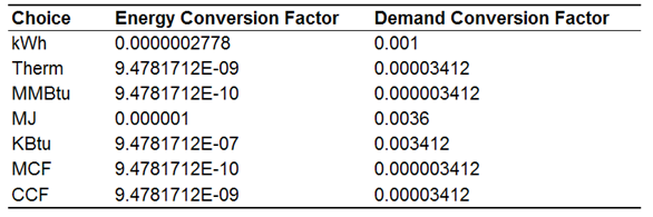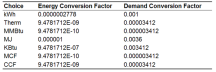 This field will be used only if Conversion factor choice is set to 1-UserDefined. It defines a multiplier used to convert energy into the units specified by the utility in their tariff. If no conversion is required, input 1 here. This is also used for all objects (such as Charge, Qualify) used in the same tariff.