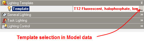 Each tab in the Model data has the name of the template last used to load the data at the top (shown in bold). At the top of the HVAC tab is the HVAC Template, at the top of the Lighting tab is the Lighting Template etc. This is the template that was previously used to load the default data, but you can load different data from a different template by clicking on the template data, then clicking again on the '...’ to the right of the template data and making a new selection. When you make the selection, the appropriate data is loaded from the template into the model.