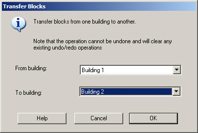 You can move blocks from one building to another using the Transfer blocks command accessed from the Edit menu when the site contains more than 1 building. This menu option opens the Transfer blocks dialog below. Select the building containing the blocks to be copied and the building to receive the blocks and Press OK. All blocks in the source building will be moved to the destination building.
