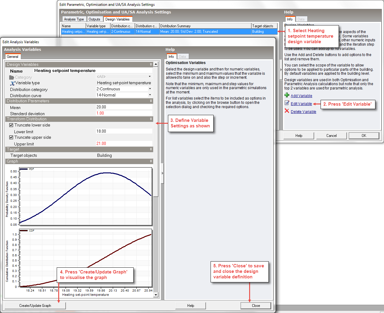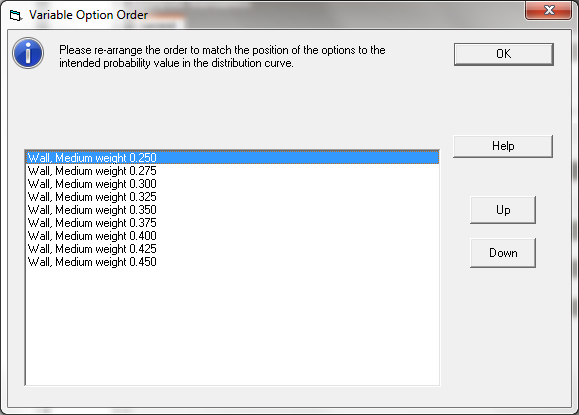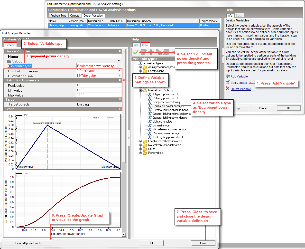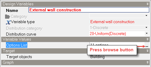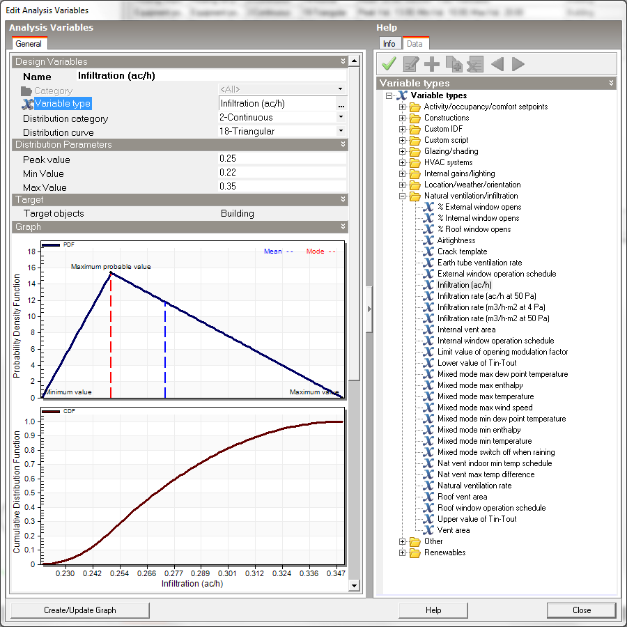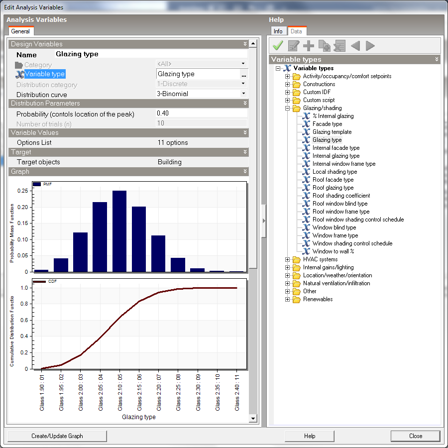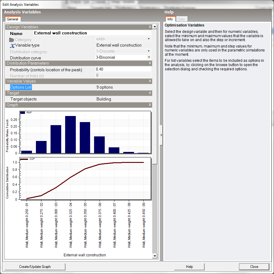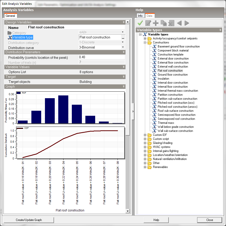 ** Wall, roof and glazing U-values are not direct inputs in EnergyPlus, therefore the variation in U-value must be represented by creating a sequence of construction components to create fixed incremental increases in U-value. Then discrete distributions can be used to represent the variation.