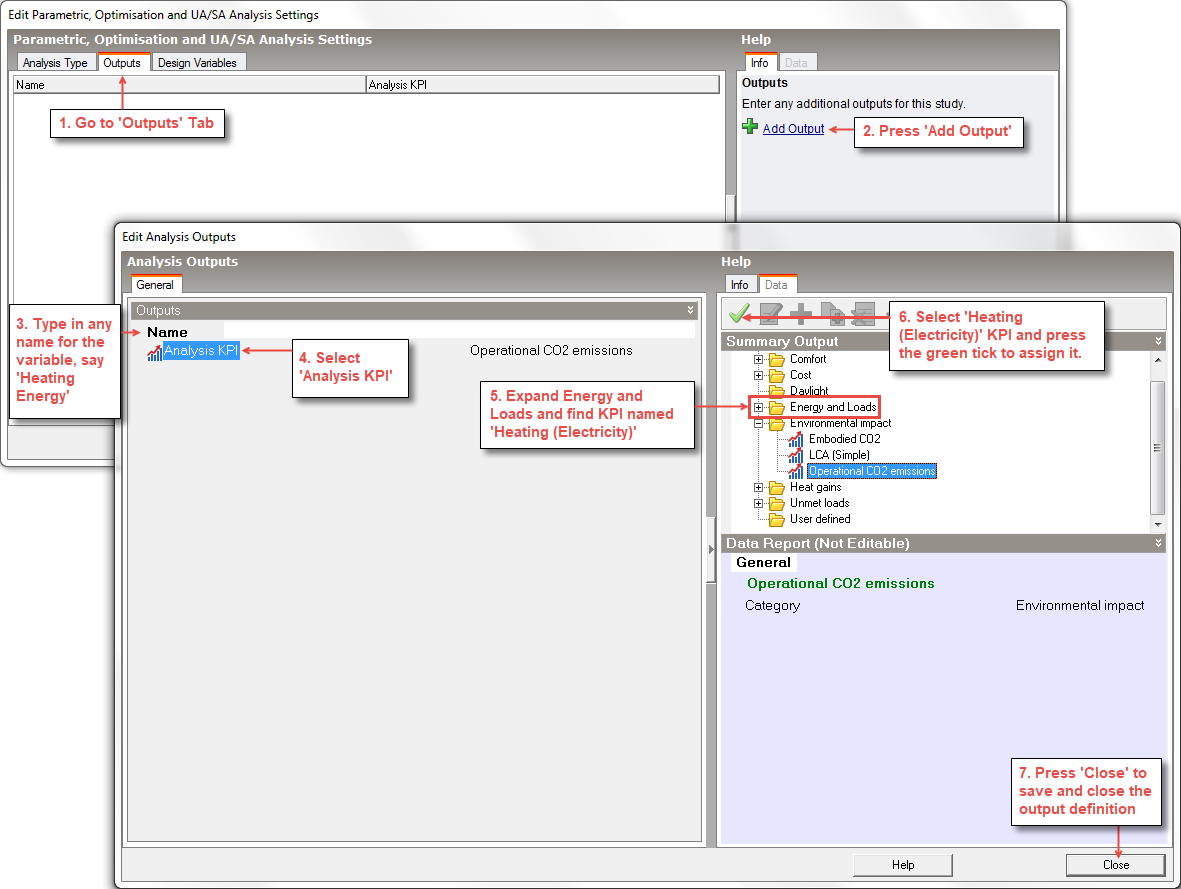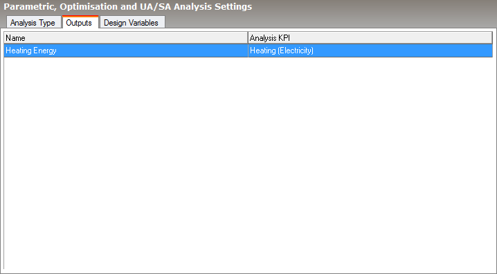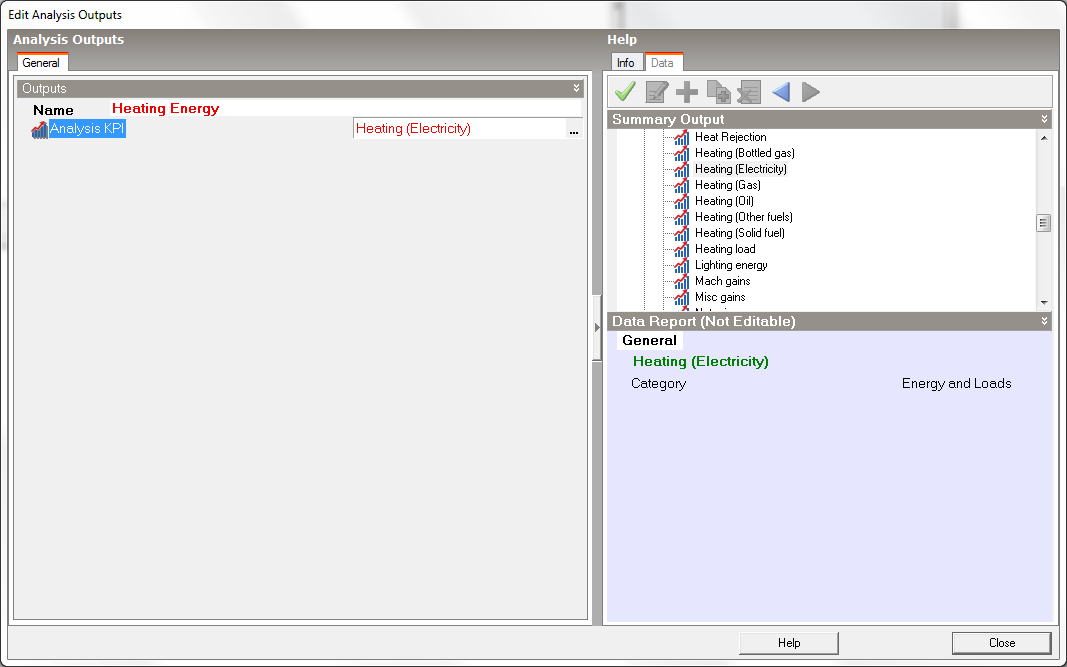 Add a new output by using the Add Output tool to access the Edit Analysis Outputs dialog. The procedure to select the Heating (Electricity) output is shown below.