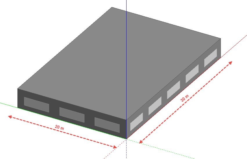 Create a new file located in London Gatwick and add a building to the site with a simple rectangular block having dimensions 30m x 20m as shown below. Use default Model options and template settings. DesignBuilder as supplied will use a Simple HVAC Fan Coil Unit system as the default. For this example, you should make sure that you have heating and cooling selected and no natural ventilation (this will be the case for a new model with an FCU HVAC system selected).