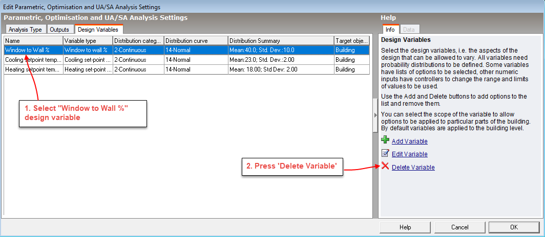 1. To remove Window to Wall % and Cooling setpoint variables, follow the steps below:
