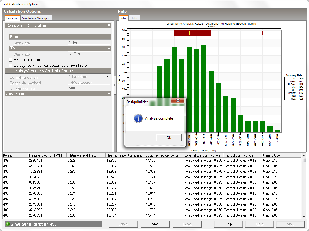 Once you have completed your review of the options press the Start button in the bottom right of the dialog. The uncertainty and sensitivity analysis process will involve running a lot of simulations. With the recommended settings there will be 500 runs with 20 runs being plotted in each batch, updating the histogram as each batch is finished. That means that 25 batches will be run! For our simple office building this shouldn't take too long with the Simulation manager running the simulations in parallel. However, if time is an issue it is usually worth starting with a smaller number of runs.