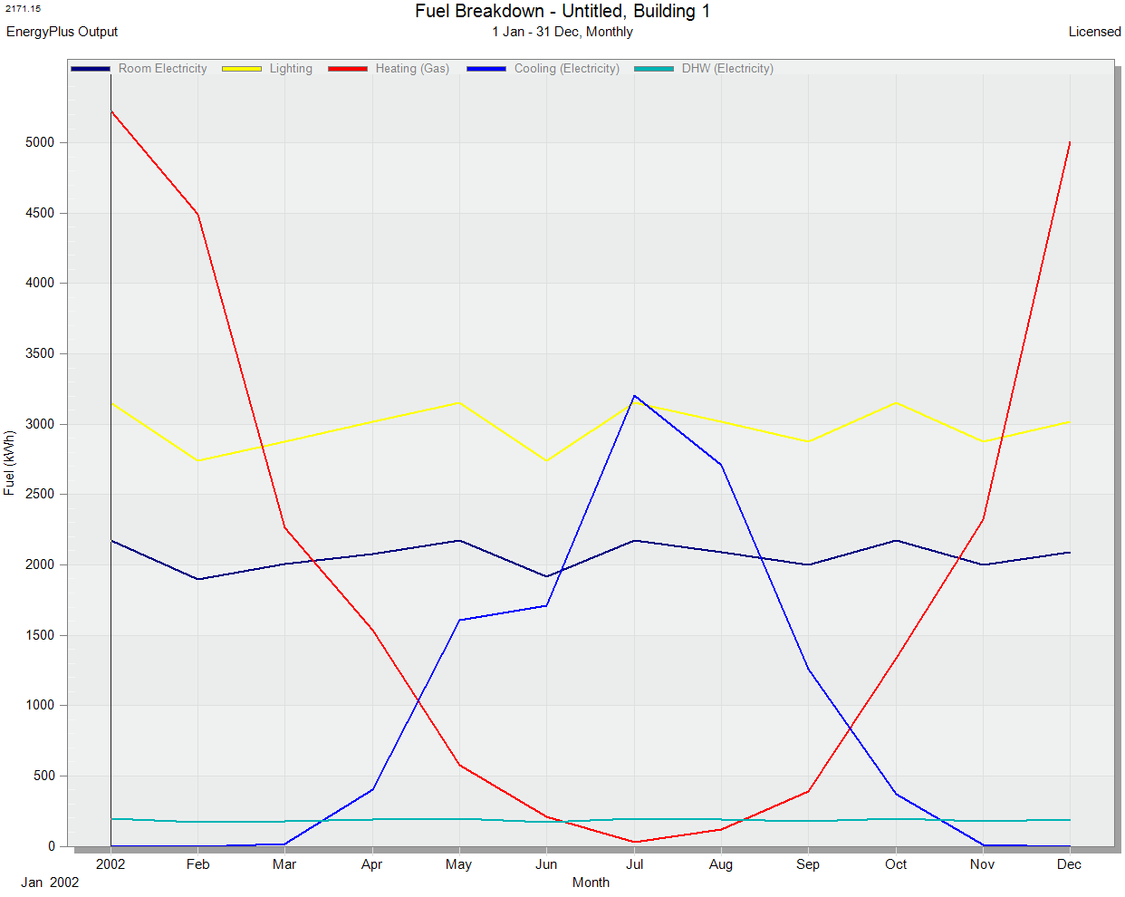 Click on the Simulation tab and run a base annual simulation. Because it is a simple model you can select hourly results. Make sure to also choose Monthly results which are required by the Optimisation. Check the hourly results for the simulation period and make sure that the model is behaving as expected, including temperatures within the building, operations periods etc. If not, adjust the model and repeat this step until you are happy with the base model hourly results. Monthly results should look something like the screenshot below.