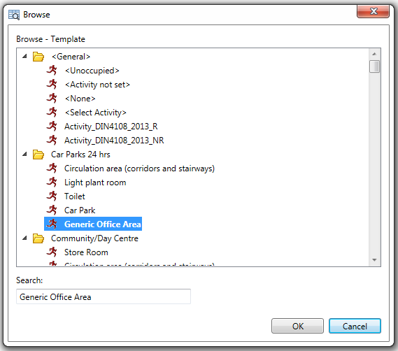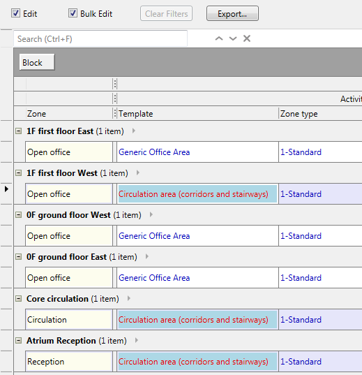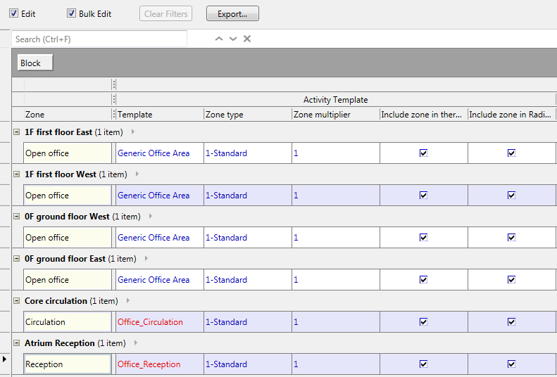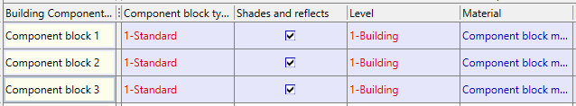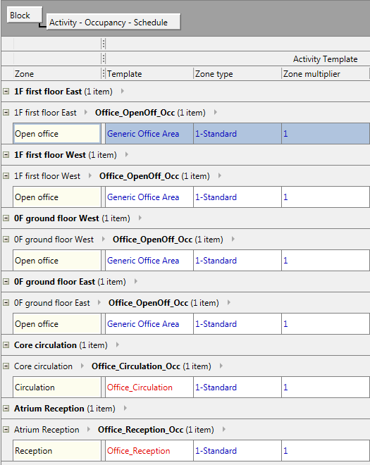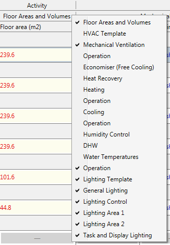 On the main model data dialogs DesignBuilder uses text colours to indicate which values are inherited from levels above in the model hierarchy using blue. Values that are hard set (i.e. not inherited) are displayed in red. A similar colour coding system is used in the Model Data Grid View. In general values that are hard set are shown in red and values that are inherited are shown in blue. There are a couple of differences in the grid though: