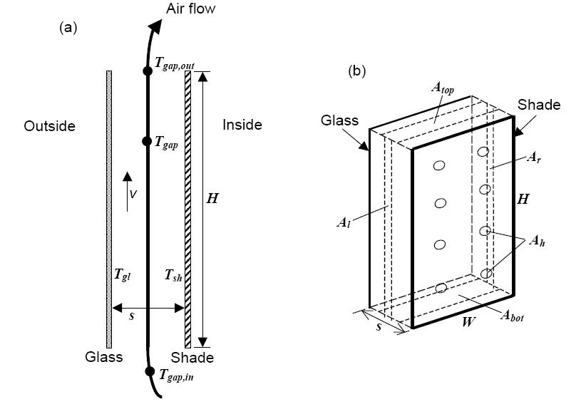 Vertical section (a) and perspective view (b) of glass and interior shade layers showing variables used in the gap air flow analysis. In (b), the air-flow opening areas Abot, Atop, Al, Ar and Ah are shown schematically. See Engineering Manual for definition of thermal variables.