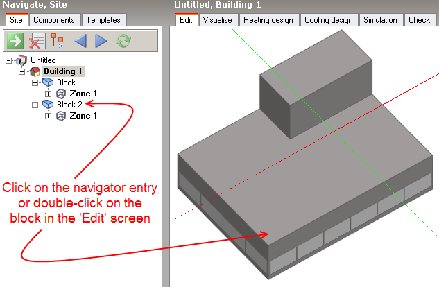 This section describes the various operations involved in partitioning a block to create zones and adding courtyards to blocks. Before you start to draw partitions or courtyards, you first need to go to the block that you want to edit and you can do this by clicking on the block entry in the navigator or by double-clicking on the block in the 'Edit' screen, if you're at the building level.