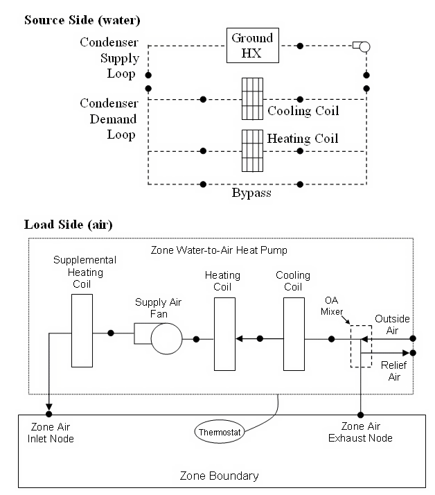 The zone water-to-air heat pump is a compound component consisting of a fan, water-to-air cooling and heating coils, and a supplemental heating coil. The heat pump switches between cooling and heating depending on the zone’s demand. The zone load (air) side of the zone water-to-air heat pump consists of an On/Off fan component, a Water to air heat pump cooling coil component, a Water to air heat pump heating coil component, and a Gas or Electric supplemental heating coil component. The source side (water) of the heat pump is connected to a condenser loop with a heat exchanger (ground heat exchanger or other type) or a plant loop with a heating source such as a boiler and a cooling source such as a chiller or cooling tower.