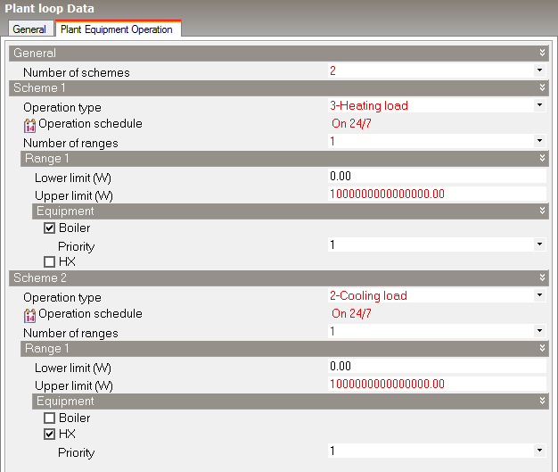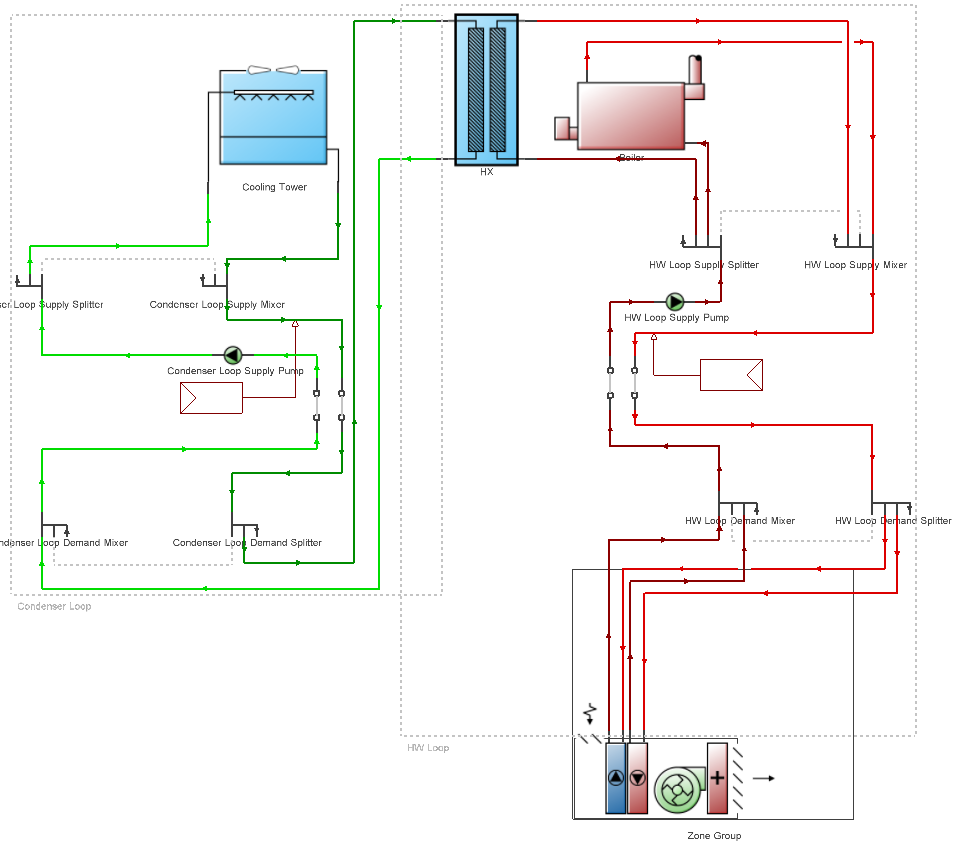 Note the use of a HX component to provide free cooling from a cooling tower from a connected condenser loop to a mixed water loop which can provide either heating or cooling depending on the zone loads. The HW loop used to supply the Zone water to air heat pump was configured as follows: