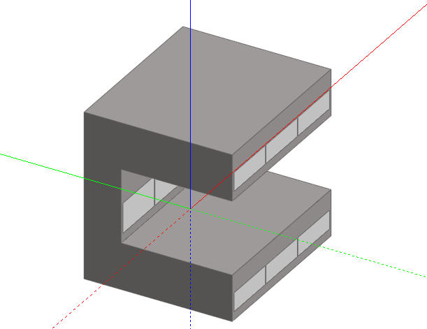 While this geometry is perfectly acceptable for the default EnergyPlus solar calculations (see Model Options), it cannot be processed by the more rigourous Full exterior and interior solar distribution option. If this latter option is required, you can either model the geometry as two separate blocks or cut the block.