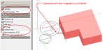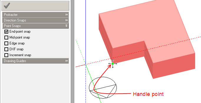When you release the mouse button, you will be able to move the object to any required location. As you move the object, a displacement line is displayed to show how far the object has been moved, the displacement line can be snapped to the axes or the Protractor. When a direction snap is active the increment snap can also be used: